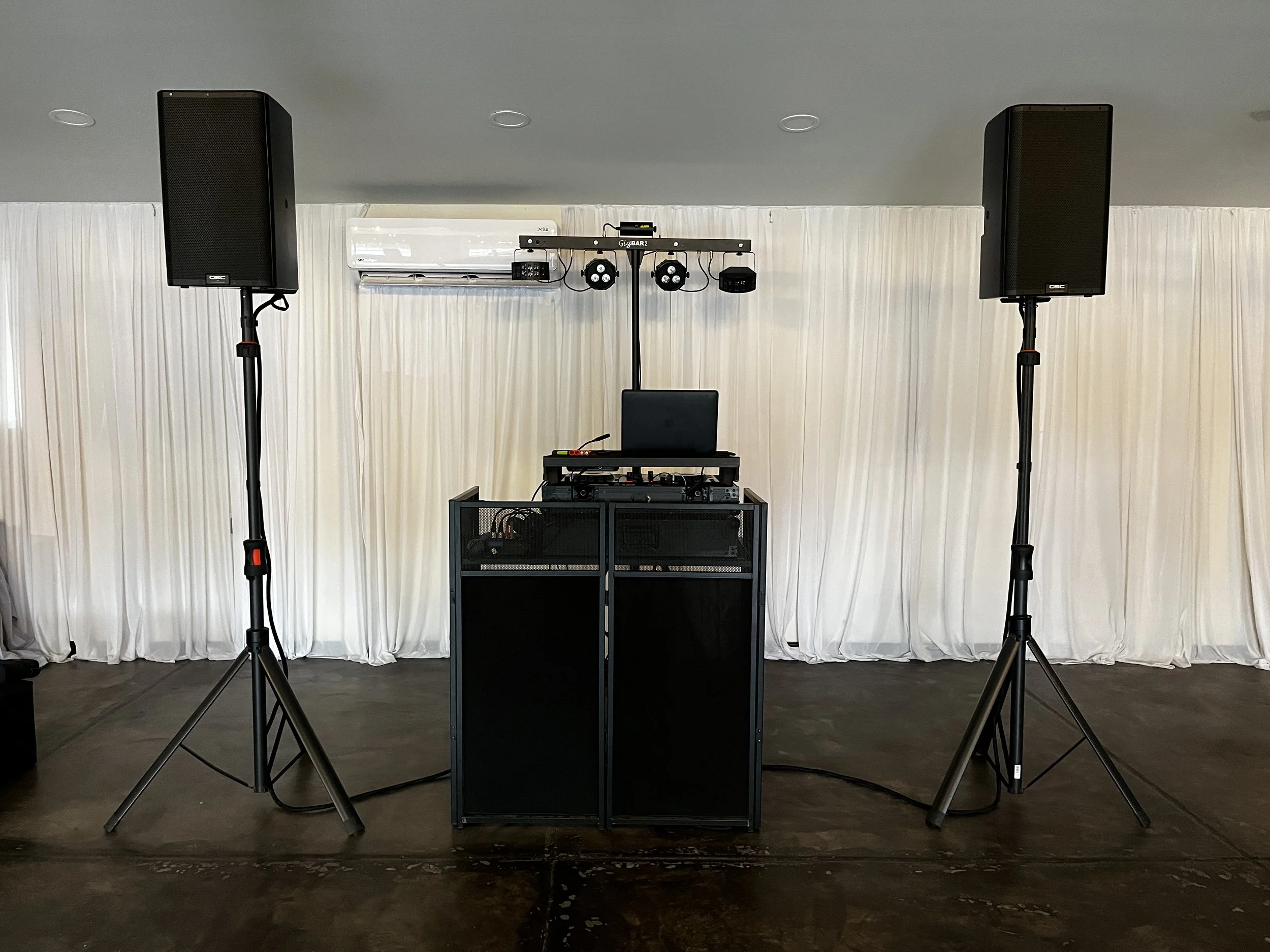 The budget/DIY solution. What’s included: Two JBL Partybox bluetooth wireless speakers, Wireless Microphones. Same day delivery, pick up and setup also included. Lights can be added for $100 extra.